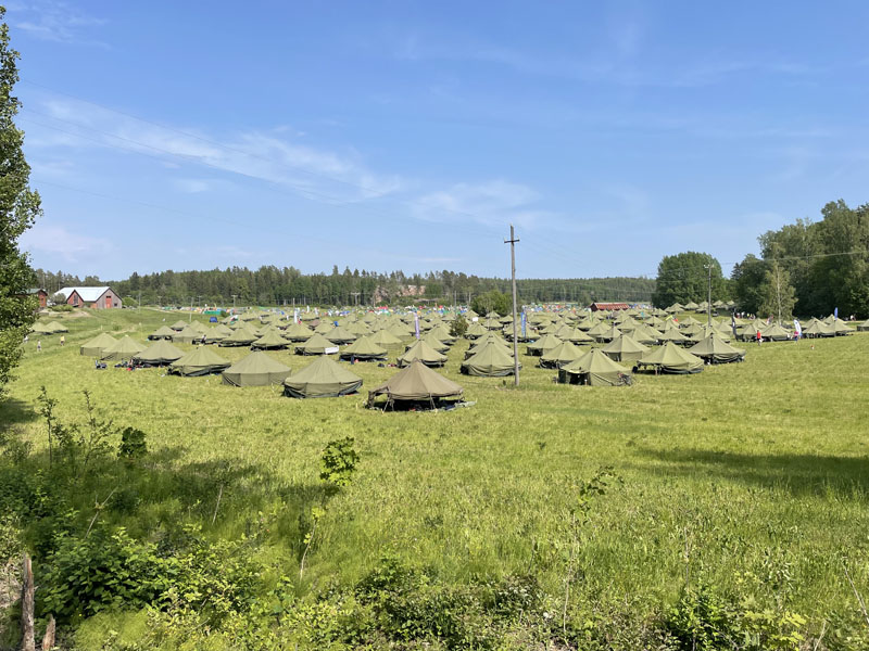 Väl framme slogs tältet kvickt upp vid TC och EMIT brickorna gjordes klara. Alla sökte sig till skuggan iom att himlen var molnlös och att Finland, temperaturmässigt, hade förflyttats till norra Afrika. Som tur var hade vi denna gång flyt med korta avstånd mellan buss, TC, växlingsplats och sovplats.