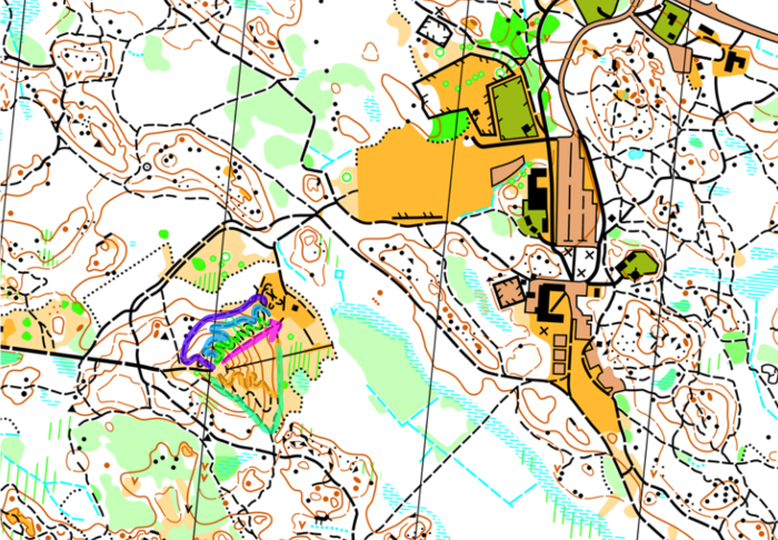 | Detaljerad beskrivning | Dagens pass: Backintervaller! Gemensam uppvärmning från LOK-gården till de backiga MTB-spåren. Tänkt upplägg: 5 minuter x3-5 gånger med 90 sekunder vila emellan. Kör så många varv du hinner under intervallerna, aktiv vila på nervägen. Behöver man vila lite extra - gör det! De med lite snabbare ben tar de längsta slingorna. Alla springer nerför på samma ställe, se rosa pil i bilden.